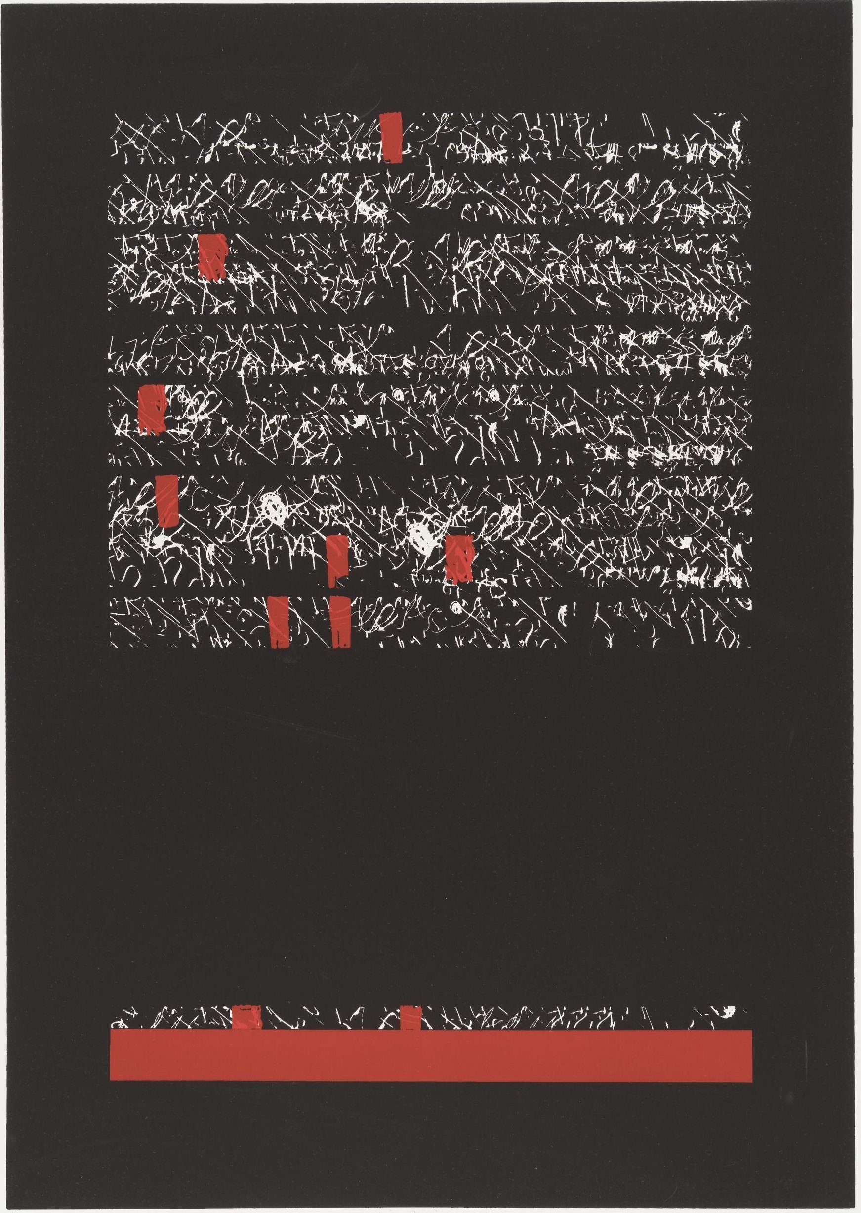 serigraph after an original unique computer-generated phototypeset image: signed and dated lower right in graphite titled lower center in graphite numbered 48/100 lower left in graphite serigraph published and published by Pratt Graphic Center, NYC, as a members gift in 1974 printed on Arches 88 paper; watermark visible upper left margin original unique computer-generated phototypeset […]