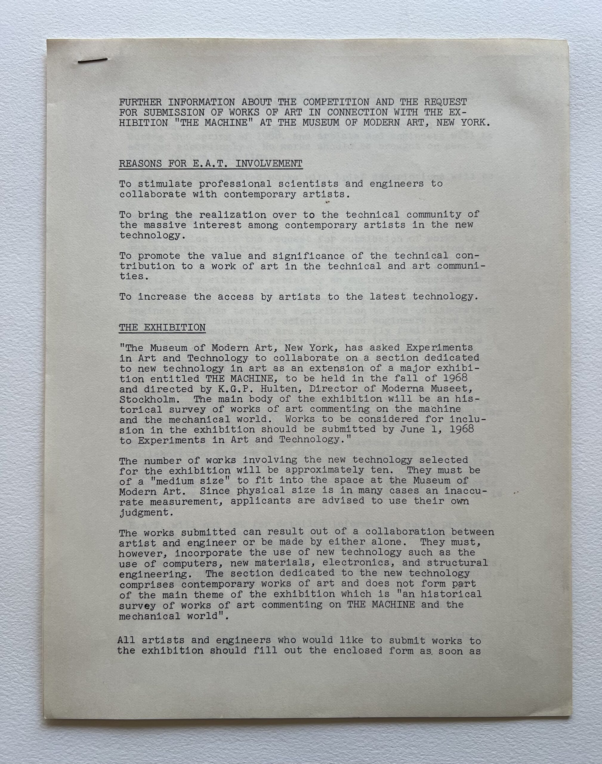 Information Pamphlet from E.A.T. MoMA Competition and Exhibition “THE MACHINE”